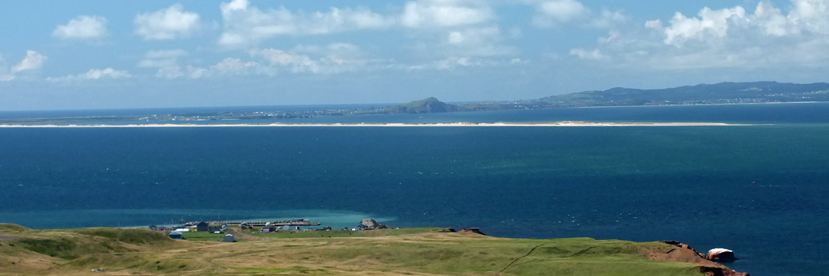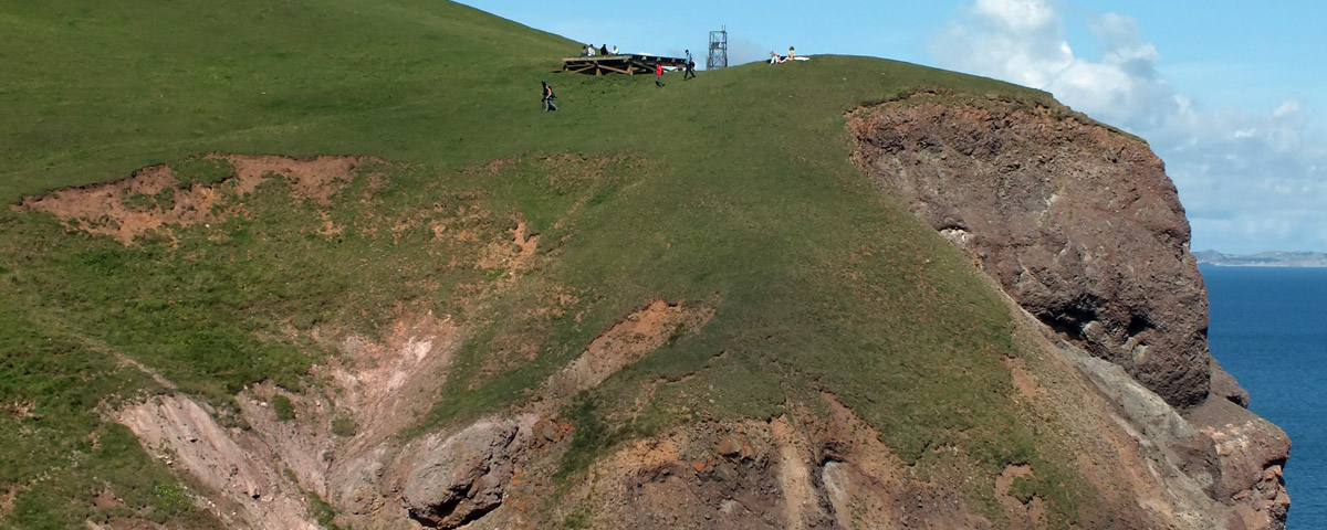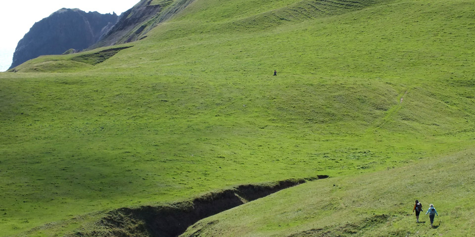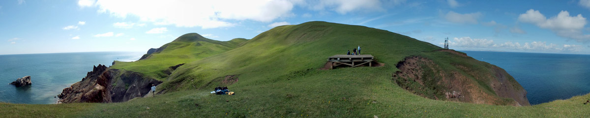 The U-shaped valley ends at cliffs at the island's northeast corner. There is a large wooden platform here--a helipad, I guess, maybe for