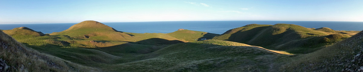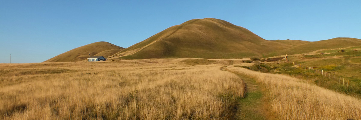 The island is divided by an electric fence, with the gently sloping townsite to the west, and hilly pasture to the east. I walk up to the end