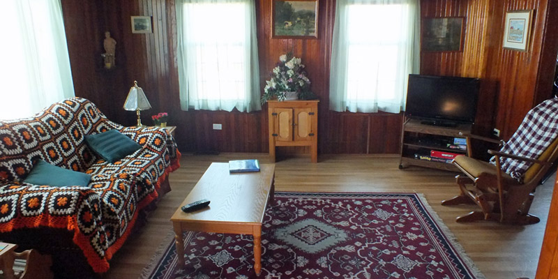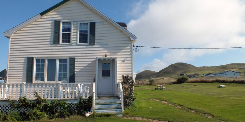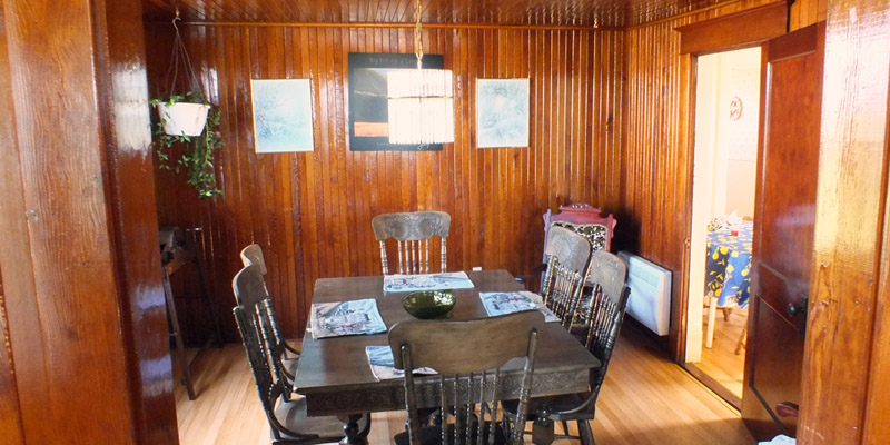 Madelinot houses, it has a sort of shelter built over the front entryway, to prevent the door being ripped off its hinges by the wind. The interior is