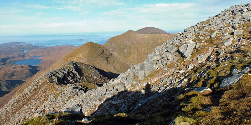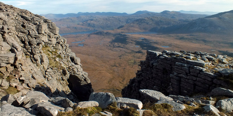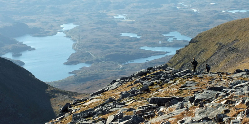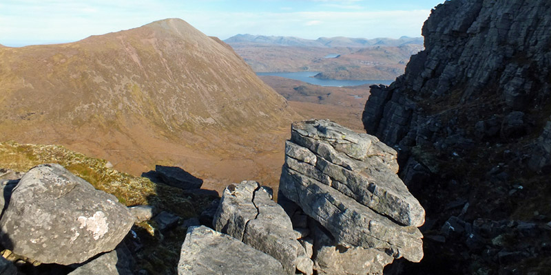 pass entails clambering down a spiky ridge, part of the rocky spine of Quinag. It's the airiest part of the day. I make it down without much trouble and