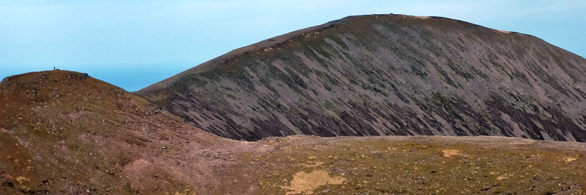 looking across a saddle at the proper peak of Spidean Còinich. The sky is clearing. The peak looks almost close enough to touch, but the two tiny specks