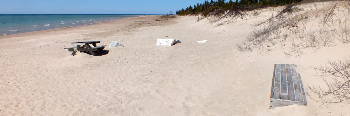 Friday 9 May 2025--I saw most of the island yesterday; today I see what's left, including the beach at Donegal Bay. As that name might suggest, Irish immigrants were the major successors to the Mormons on Beaver Island. Later, I relax and enjoy a dram back at my room. I paid a little extra to get the one room at the motel with a patio, which affords me this view across the harbor.