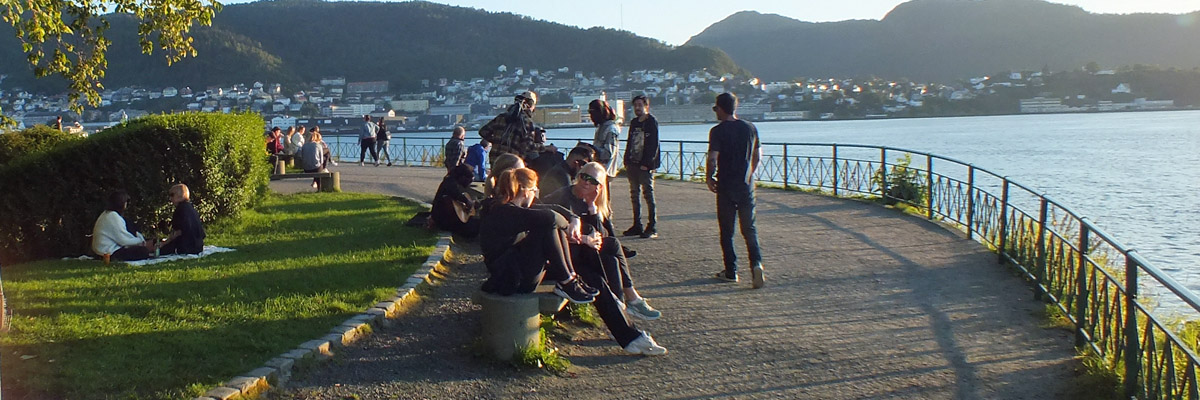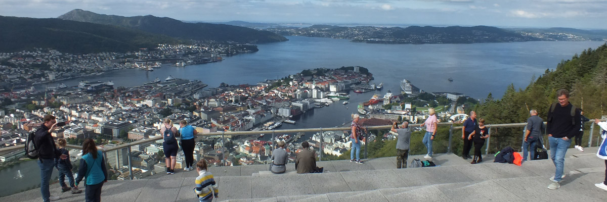 platform, enjoying the sunshine and the view over Bergen and the fjord beyond.