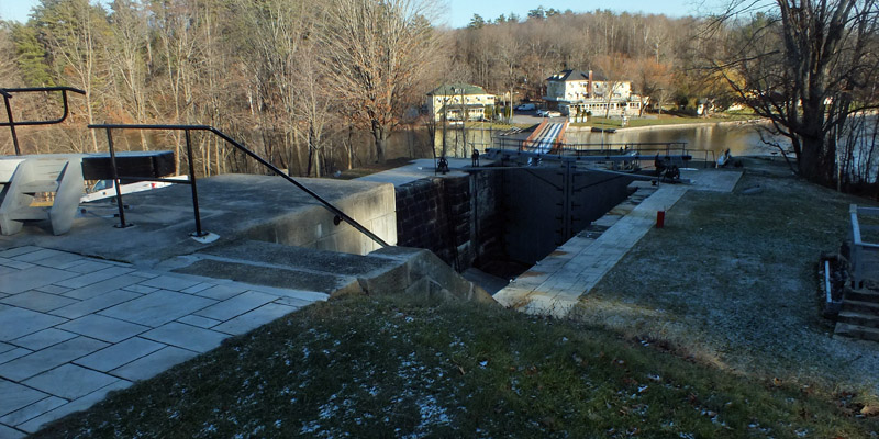 It's evident from scaffolding that work is being done on the upper lock, and as I walk back to my car, I happen to catch one of the workmen as he is knocking off for the day. He tells me that the masonry in each lock has to be disassembled and rebuilt occasionally. This is done when the canal is closed in winter, under a heated tent. It's not until I'm driving back to Westport that it occurs to me to ask him how often this needs to be done, and a thousand other questions.