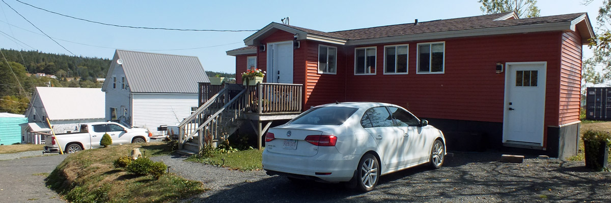 Back through the smoke sheds, past the house, and up the street we walk to High Seas Convenience for fish and chips. It seems to be standard for convenience stores here to have a grill and a fryer. As well as a counter, High Seas has a nice patio looking over the village and the bay.