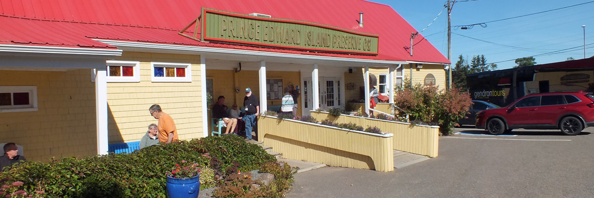Ron has never been on PEI before. Crossing the seven-mile bridge takes ten minutes or so. Not having planned anything in advance, I fall back on my touring experience. I want to stop at the PEI Preserve Company, anyway, to see how they're doing, since it was recently sold. Four buses parked in front suggest that not much has changed. The original proprietor, a character named Bruce Alexander MacNaughton, used to greet every bus in kilt and sporran. The new owners are PEI tourism industry veterans, and they obviously know better than to mess around much with a good thing.
